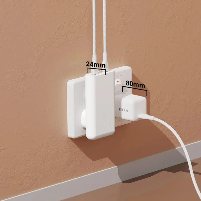 - Introducing the EFM 65W Slimline Wall Charger, the ultimate powerhouse that is slim enough to fit anywhere. Its super-flat design sticks out just 24mm from the wall, making it a perfect fit behind furniture. With an impressive 65W output, it has got enough juice to charge your mobile phones, tablets, and even some laptops.Thanks to its super-efficient GaN technology, you get extremely fast, efficient and reliable charging without any bulk. Plus, the dual upward-facing ports make plugging in two cables easy and hassle-free. With the housing crafted from 100 percent post-consumer recycled materials, it is eco-friendly without compromising on performance. Powerful, compact, and sustainable charger does it all.