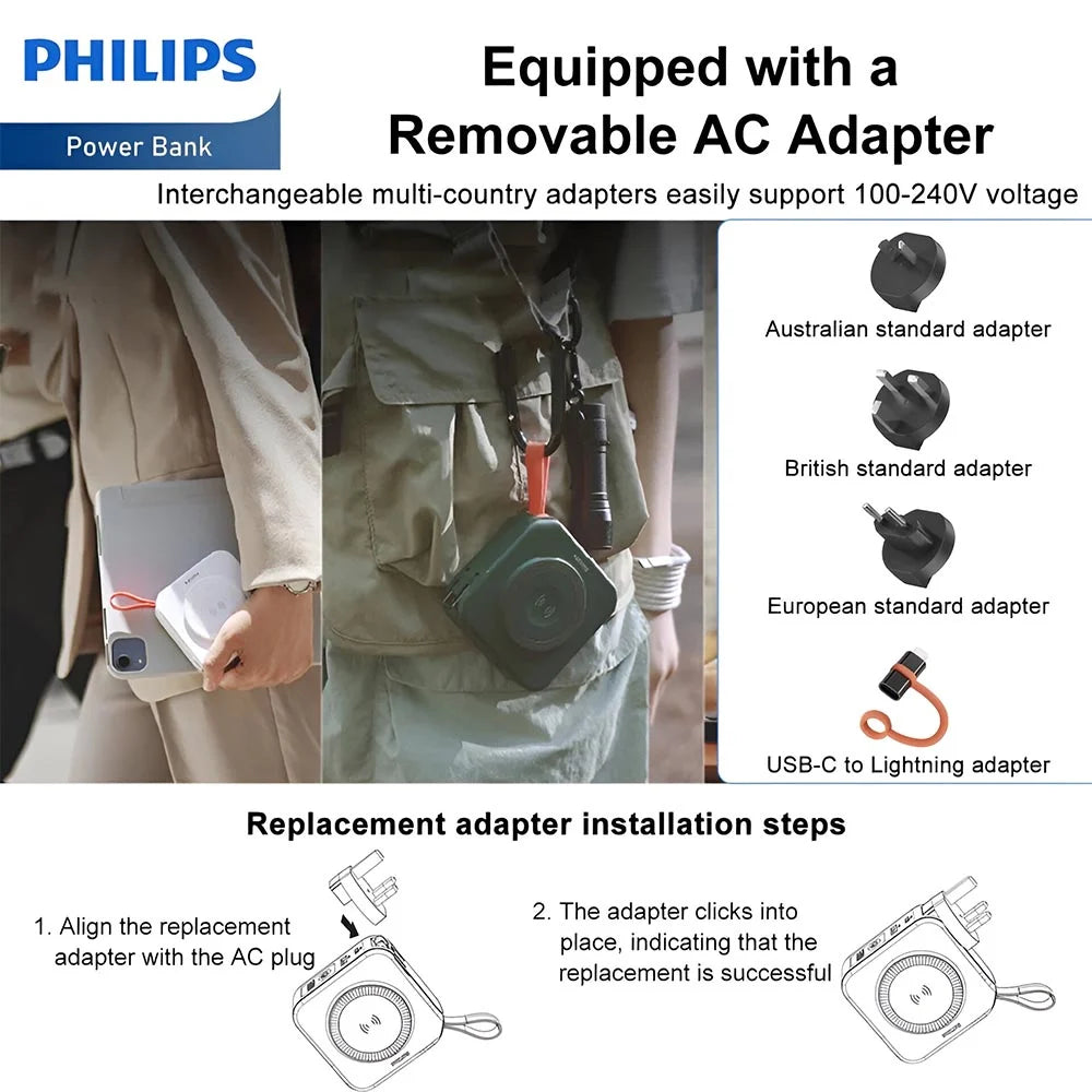 -Global Portability Designed for travel, the 3-in-1 powerBank includes interchangeable adapters for global use and a convenient travel pouch to keep your charging essentials organized. Bring it with you anywhere in the world, so you will never run out of power.